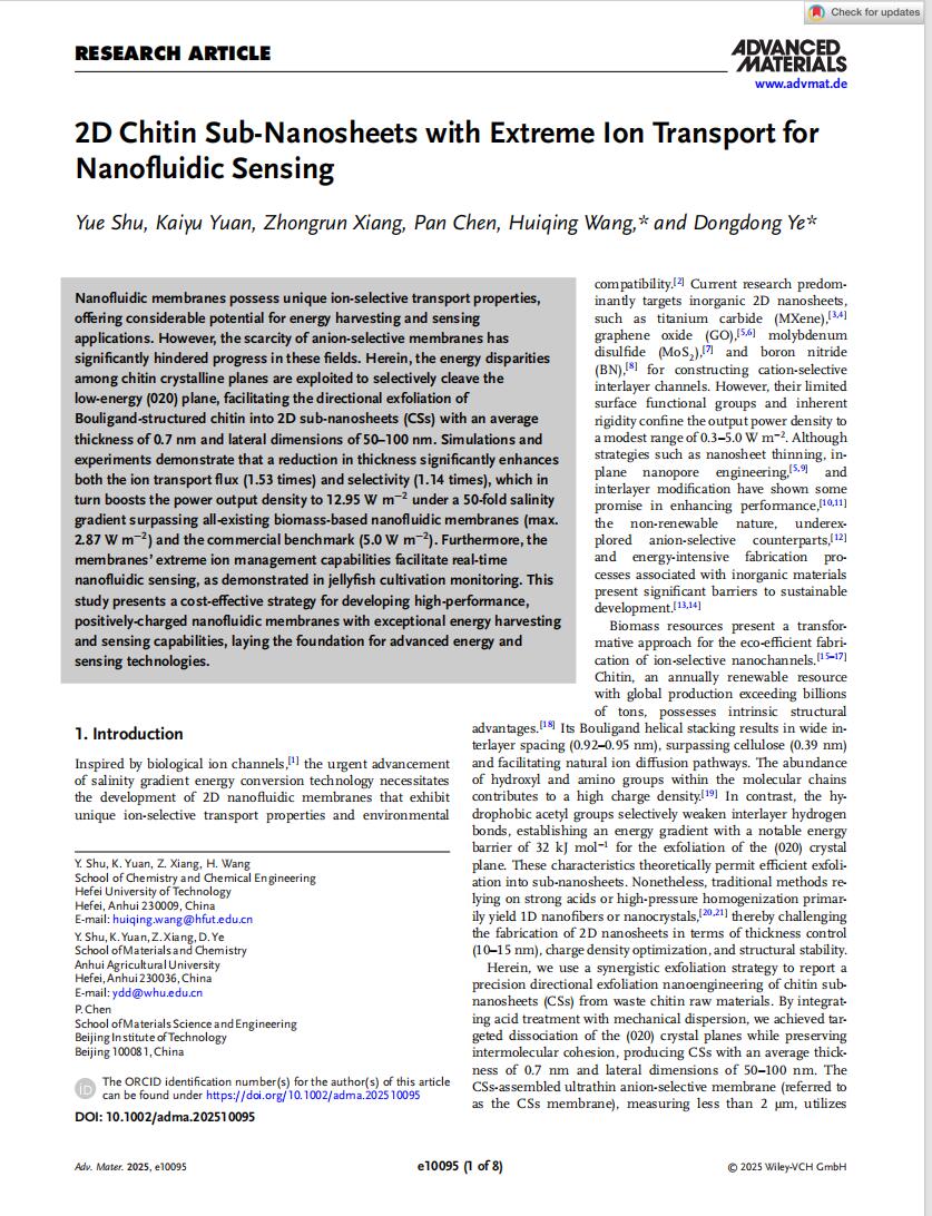 甲壳素亚纳米片能源收集系统发表在顶刊Advanced Materials